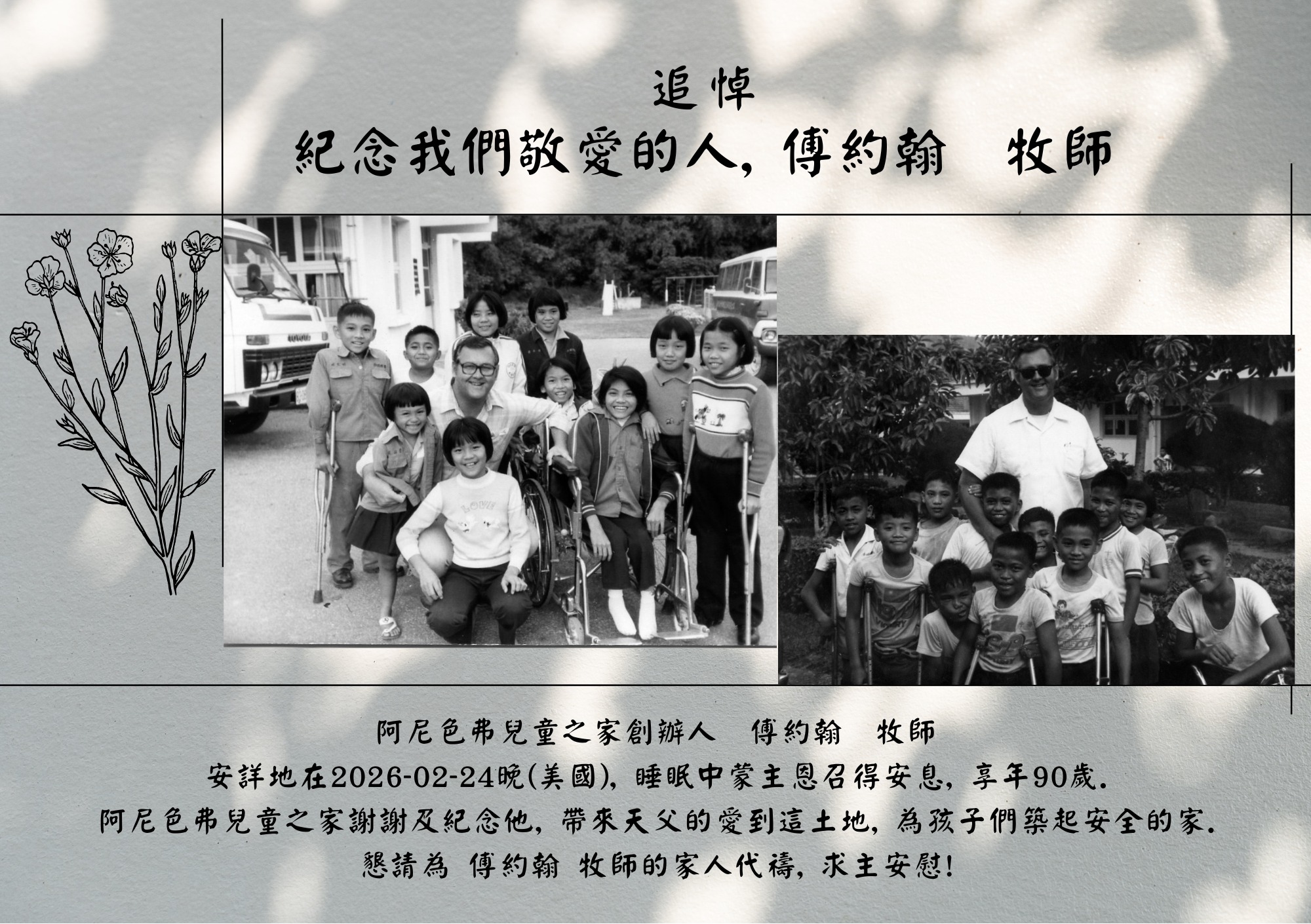 西元一九六九年,台灣阿尼色弗兒童之家創辦人傅約翰牧師,接受美國『阿尼色弗總會』的差派,帶著美國基督徒們的愛前赴台灣,義無反顧地要照顧罹患小兒痲痺亟待幫助的孩子們。